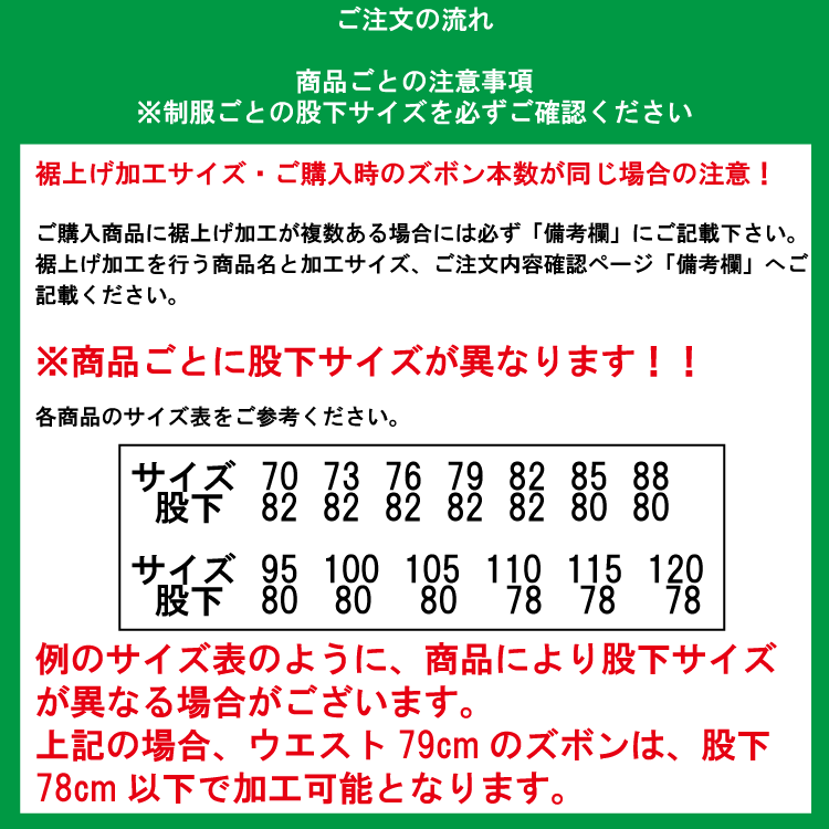 ・商品番号・カラー・ウエストサイズ・ご希望の裾上げサイズ・加工枚数