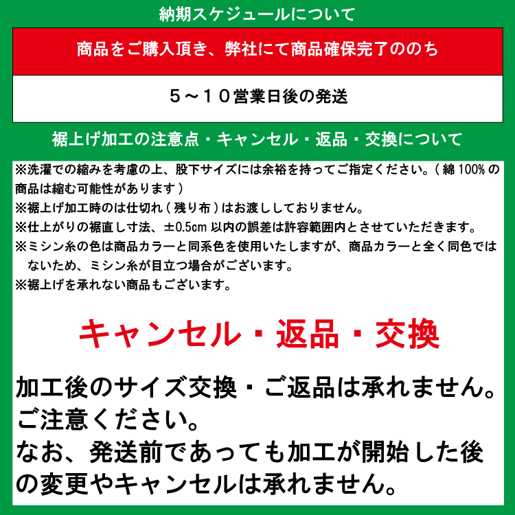 ※商品特性上、裾上げが難しいと判断した場合は、裾上げのご注文をキャンセルさせていただきますので予めご了承くださいませ。