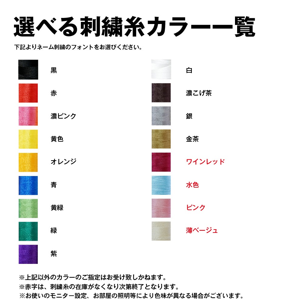 ※商品特性上、刺繍が難しいと判断した場合は、ネーム刺繍のご注文をキャンセルさせていただきますので予めご了承くださいませ。