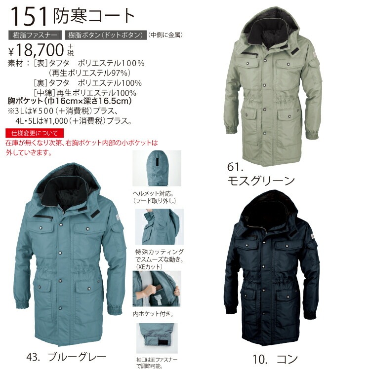 | 《サイズ》S M L LL 3L 4L 5L 《カラー》コン モスグリーン ブルーグレー XEBEC(ジーベック)のコートは、厳しい冬の作業環境やアウトドアシーンでの快適性と機能性を追求した高品質な防寒ウェアです。 防水性・防風性・保温性に優れた素材と設計により、寒冷地や悪天候下でも快適な作業をサポートします。 過酷な作業環境やアウトドアシーンでも快適に過ごせるよう設計されており、耐久性と機能性を兼ね備えた信頼性の高いアイテムです。 防寒性や防水性、動きやすさを重視する方におすすめの一着です。 主な特徴と機能 優れた防水・防風性能 耐水圧8000mmの防水性を持つモデルや、透湿性2000gの素材を使用したモデルなど、雨や雪、風の侵入を防ぎつつ、衣服内のムレを軽減します。 高い保温性と快適性 中綿や裏地に保温性の高い素材を使用し、体温を逃がさず暖かさをキープ。 蓄熱保温素材や再生キルトを採用したモデルもあり、環境に配慮しつつ快適な着心地を実現しています。 機能的なデザイン フードイン仕様や着脱可能な衿ボア、ハンドウォーマーポケット、携帯電話収納ポケットなど、作業中の利便性を考慮した設計が施されています。 環境への配慮 再生ポリエステルを使用したエコ防寒シリーズは、グリーン購入法適合商品として、環境保護と機能性を両立しています。 ご注意点 ・お使いのPCモニターによって、カラー表現が変わって見える場合がございます。 ・万が一弊社在庫分に、不良や欠品があった場合は、メーカー取り寄せとなり納期が変更となる場合がございます。 ・在庫切れにより商品のご用意が難しい場合は、別途ご連絡致しますので予めご了承くださいますようお願い致します。 おしゃれ人気のワークウェア 半袖や長袖のバリエーションが豊富 ズボン・パンツ・ベルトなどなど 。お気に入りの商品を多数ご用意!! BURTLE(バートル)、桑和(SOWA)、自重堂、AITOZ(アイトス)、TSDesign、EVENRIVER、ATACKBACE、空調服・防寒・エアークラフト・春夏対応・秋冬対応など多数取り揃えております。 お届けについて ご注文確認後、2~5営業日で出荷致します。 お届け日のご要望がある場合は、お電話・メールにてお気軽にご相談ください。 出来る限りご対応致します。 ご注意点 ・お使いのPCモニターによって、カラー表現が変わって見える場合がございます。 ・万が一弊社在庫分に、不良や欠品があった場合は、メーカー取り寄せとなり納期が変更となる場合がございます。 ・在庫切れにより商品のご用意が難しい場合は、別途ご連絡致しますので予めご了承くださいますようお願い致します。 |