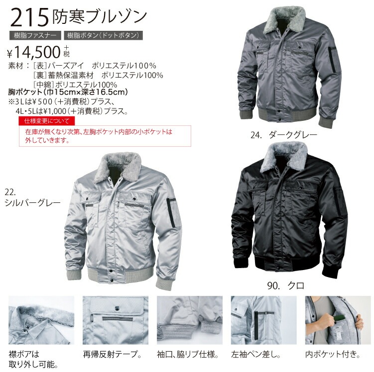 | 《サイズ》M L LL 3L 4L 5L 《カラー》シルバーグレー クロ ダークグレー XEBEC(ジーベック)のブルゾンは、作業現場やアウトドアシーンでの快適性と機能性を追求した高品質なワークウェアです。 季節や用途に応じた多彩なラインナップが特徴で、動きやすさや耐久性、快適性を兼ね備えています。 作業環境や季節、個々のニーズに応じて最適なモデルを選ぶことができ、快適で安全な作業をサポートします。 耐久性と機能性を兼ね備えたジーベックのブルゾンは、プロフェッショナルな現場で信頼されるアイテムです。 主な特徴と機能 優れたストレッチ性と動きやすさ 多くのモデルでストレッチ素材を採用しており、作業中の動作を妨げず、快適な着用感を提供します。 帯電防止機能 JIS T8118適合の帯電防止素材を使用したモデルもあり、静電気によるトラブルを防ぎます。 環境に配慮した素材 植物由来のエコ素材「Sorona?」や再生ポリエステルを使用したモデルは、環境への配慮と高い機能性を両立しています。 季節に応じた快適性 春夏用モデルでは、接触冷感素材や吸汗速乾性に優れた素材を使用し、暑い季節でも快適に着用できます。 秋冬用モデルでは、防水性や保温性に優れた素材を使用し、寒冷な環境でも快適に作業できます。 豊富なサイズ展開とユニセックス対応 SSから5Lまでの幅広いサイズ展開で、男女問わず着用可能なモデルが揃っています。 ご注意点 ・お使いのPCモニターによって、カラー表現が変わって見える場合がございます。 ・万が一弊社在庫分に、不良や欠品があった場合は、メーカー取り寄せとなり納期が変更となる場合がございます。 ・在庫切れにより商品のご用意が難しい場合は、別途ご連絡致しますので予めご了承くださいますようお願い致します。 おしゃれ人気のワークウェア 半袖や長袖のバリエーションが豊富 ズボン・パンツ・ベルトなどなど 。お気に入りの商品を多数ご用意!! BURTLE(バートル)、桑和(SOWA)、自重堂、AITOZ(アイトス)、TSDesign、EVENRIVER、ATACKBACE、空調服・防寒・エアークラフト・春夏対応・秋冬対応など多数取り揃えております。 お届けについて ご注文確認後、2~5営業日で出荷致します。 お届け日のご要望がある場合は、お電話・メールにてお気軽にご相談ください。 出来る限りご対応致します。 ご注意点 ・お使いのPCモニターによって、カラー表現が変わって見える場合がございます。 ・万が一弊社在庫分に、不良や欠品があった場合は、メーカー取り寄せとなり納期が変更となる場合がございます。 ・在庫切れにより商品のご用意が難しい場合は、別途ご連絡致しますので予めご了承くださいますようお願い致します。 |